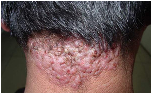疤痕疙瘩实质上是皮肤上的一种结缔组织瘤,是以具有持续性强大增生力为特点的疤痕,常表现为向四周健全皮肤呈蟹足样浸润的形象,病变隆出皮面,高低不平,形状不规则,质硬韧,多感奇痒难忍。