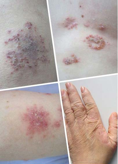 急性湿疹:多数以丘疹、丘疱疹为主,有明显的点状或小片状糜烂、渗液、结痂。损害境界不清,合并感染的时候可以出现脓疱、脓性渗出和痂屑。此类疾病治疗时主要以药物控制渗出,2-3%硼酸溶液或生理盐水等湿敷,每次30-60min,每日2-4次,湿敷间隔可使用氧化性糊等,待皮损干燥后可以使用糖皮质激素或钙调磷酸酶抑制剂类药膏。